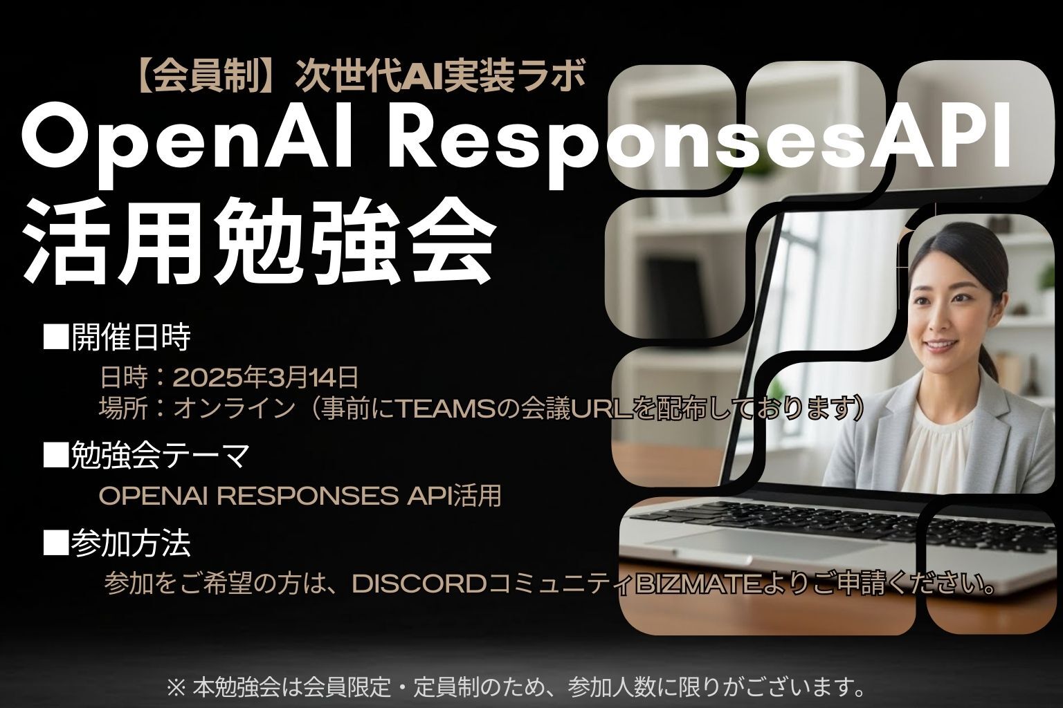 本勉強会は、会員制・少人数制のクローズド形式で開催し、参加者同士が安心して技術的な質問や運用課題を共有できる場としています。OpenAI Responses APIをこれから試したい方はもちろん、すでにAPI連携を行っており、より柔軟で拡張性の高い実装を目指したい方にも適した内容です。