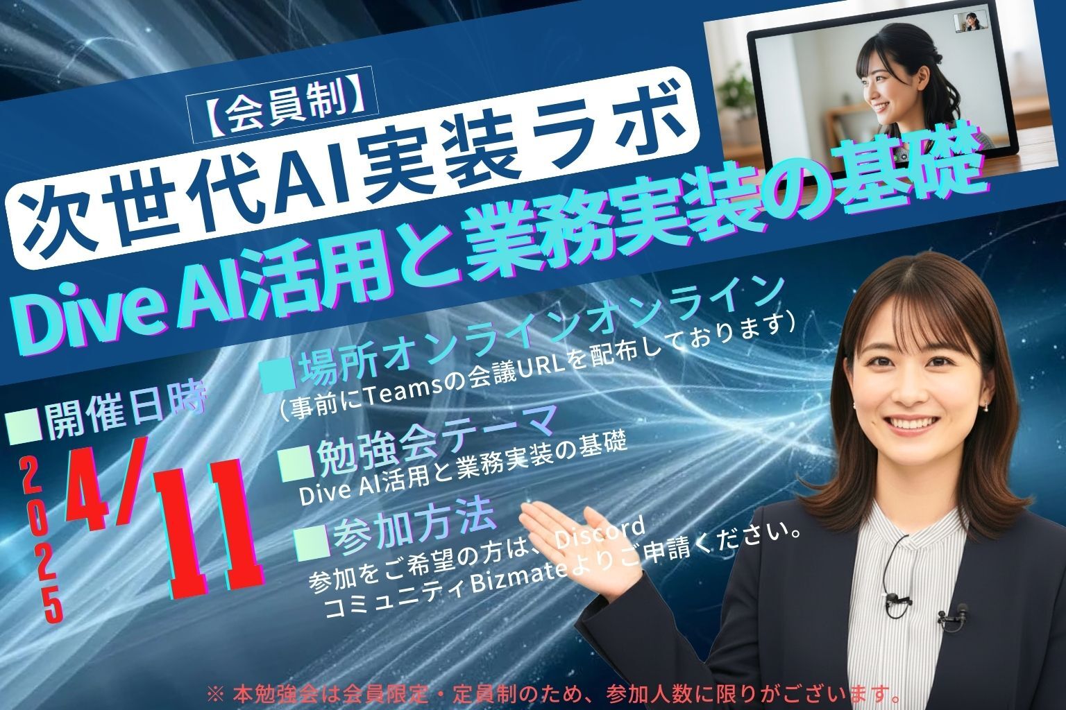 勉強会では、Dive AIの基本機能の理解から、業務フローへの組み込み方、実際の活用シーンを想定した設計の考え方、導入時につまずきやすいポイントまでを取り上げます。単なるツール紹介にとどまらず、業務改善や自動化につなげるための実践的な視点を重視した内容としています。