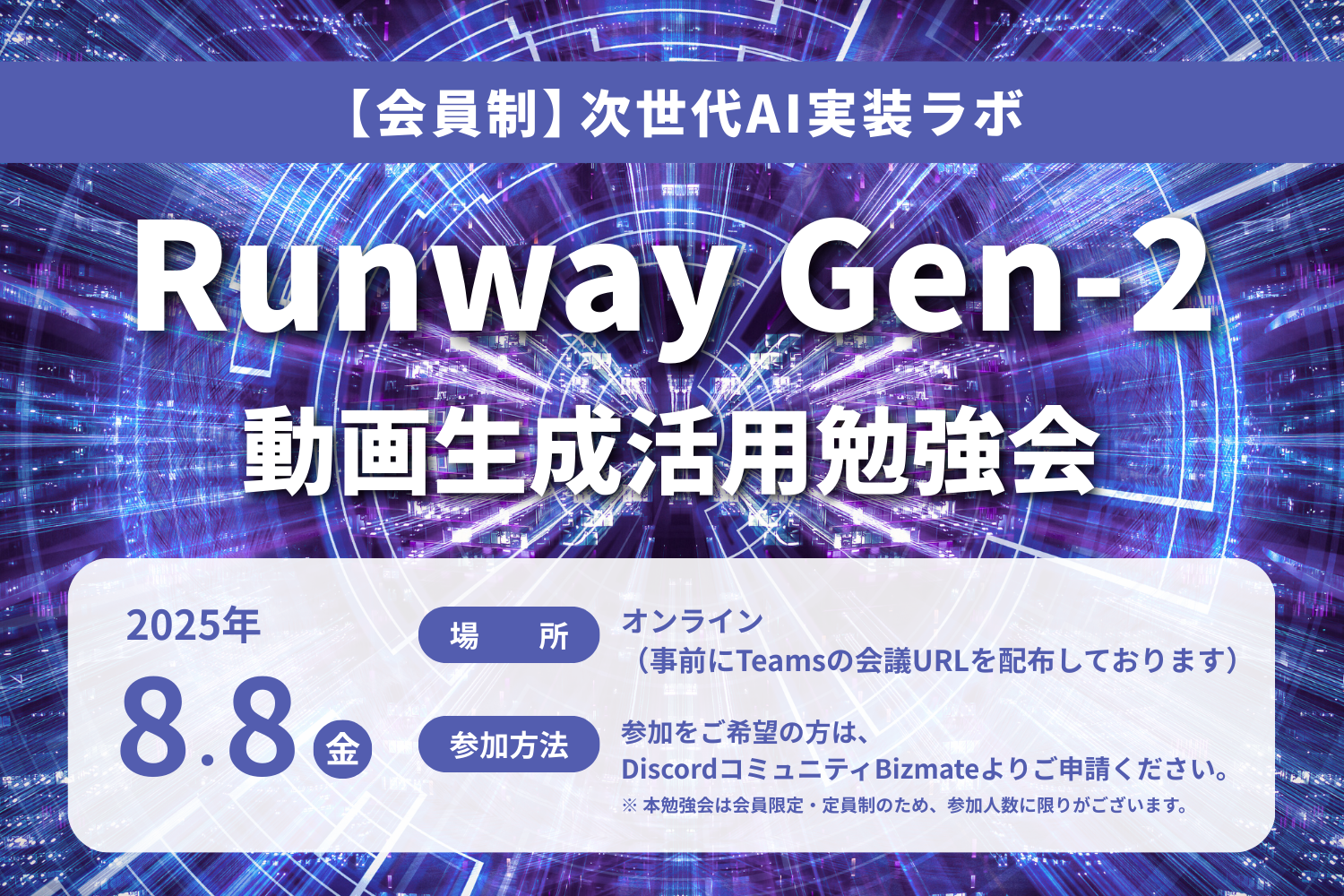 ICコンサルティング合同会社は、会員制の次世代AI実装ラボとして、Runway Gen-2を活用した動画生成と実務への応用をテーマとした勉強会を開催いたします。